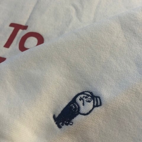 ネイビーはピグメント染め&ウォッシュ加工でヴィンテージライクなフェード感を再現。フロントのクラックプリントと左袖の刺繍キャラクターがアクセントに。