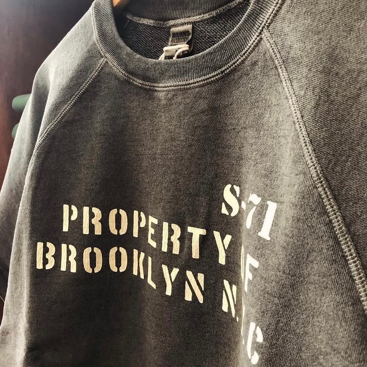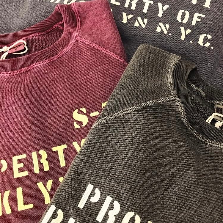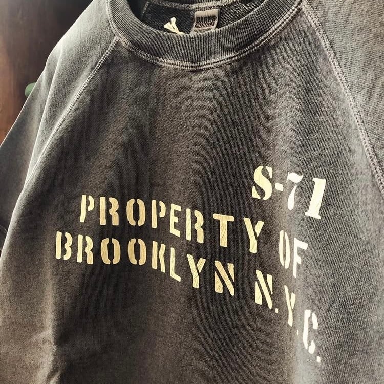 スラブ糸の凹凸感とピグメント染めで リアルヴィンテージな風合い を演出し、ミリタリーテイストのステンシル風プリントがアクセント。