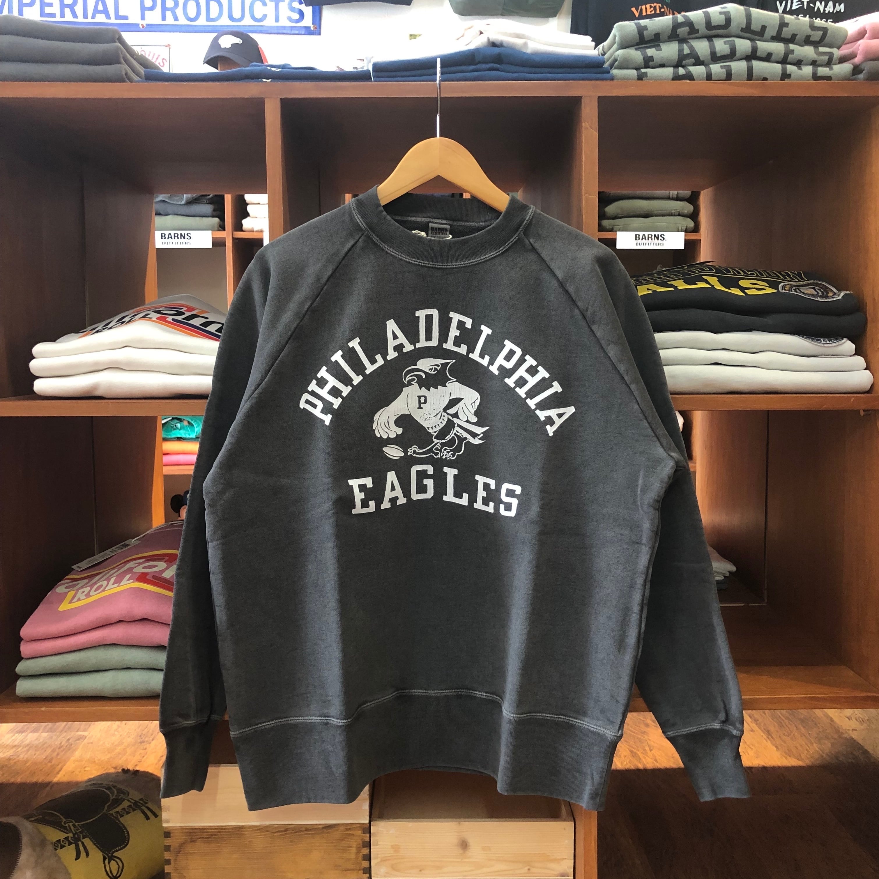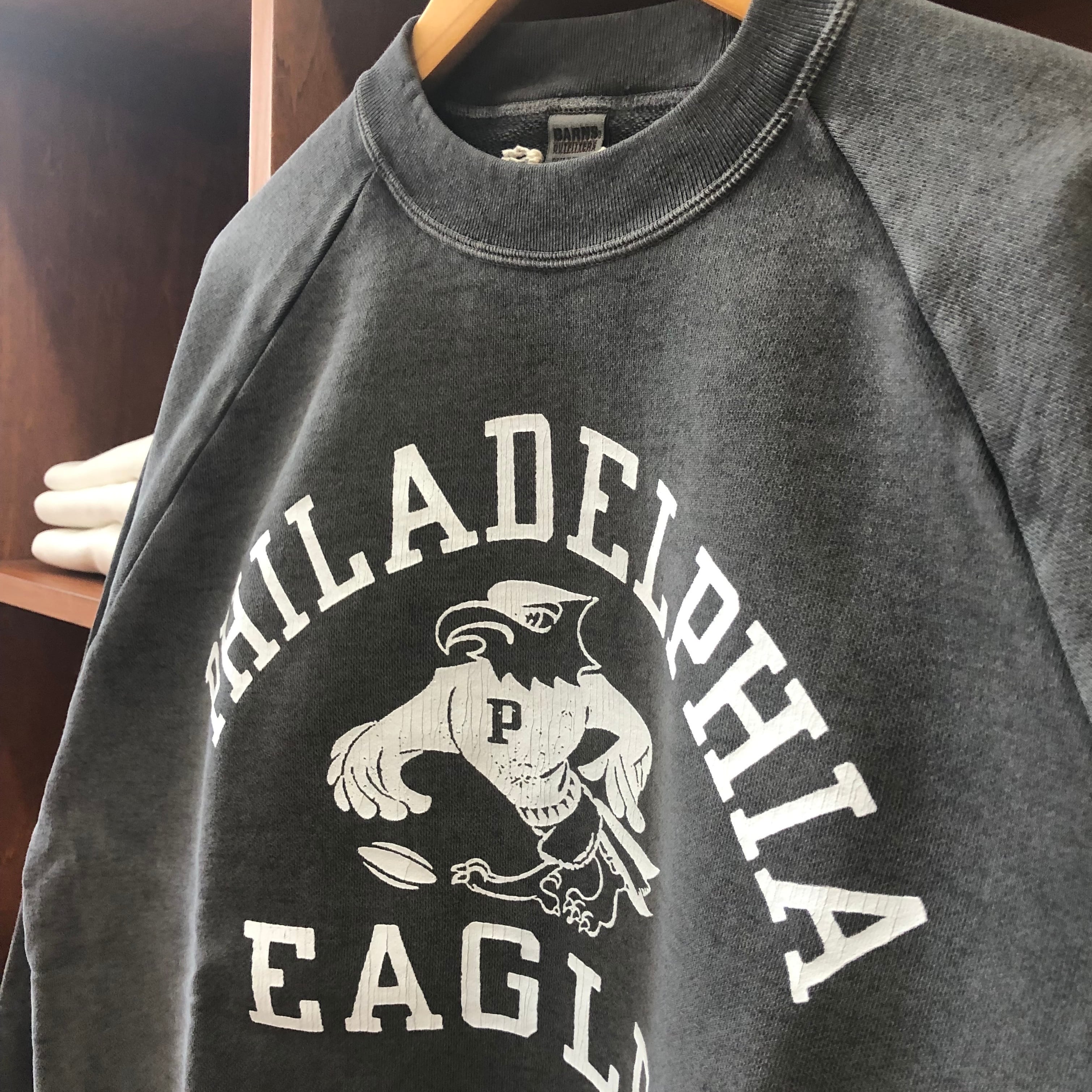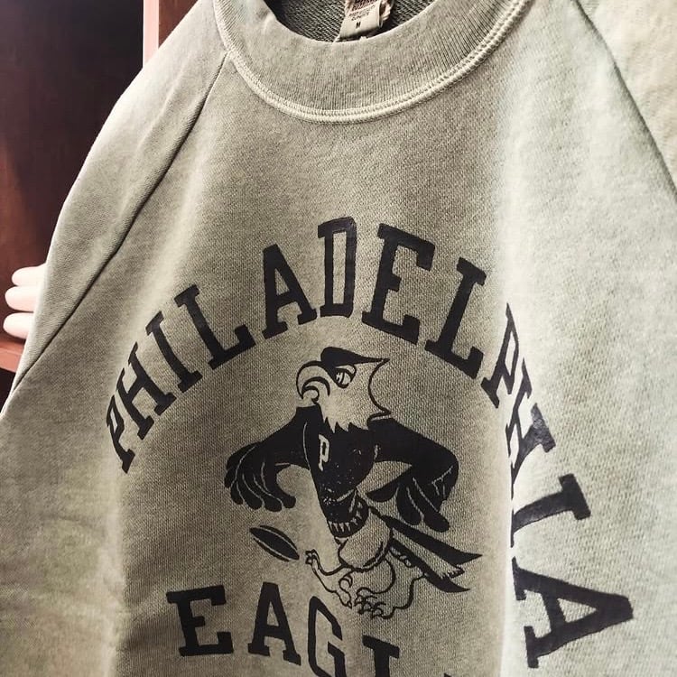 フロントに “PHILADELPHIA EAGLES” カレッジロゴをクラックプリントで配置し、ナチュラルな色落ちと古着風の風合いが特徴です。