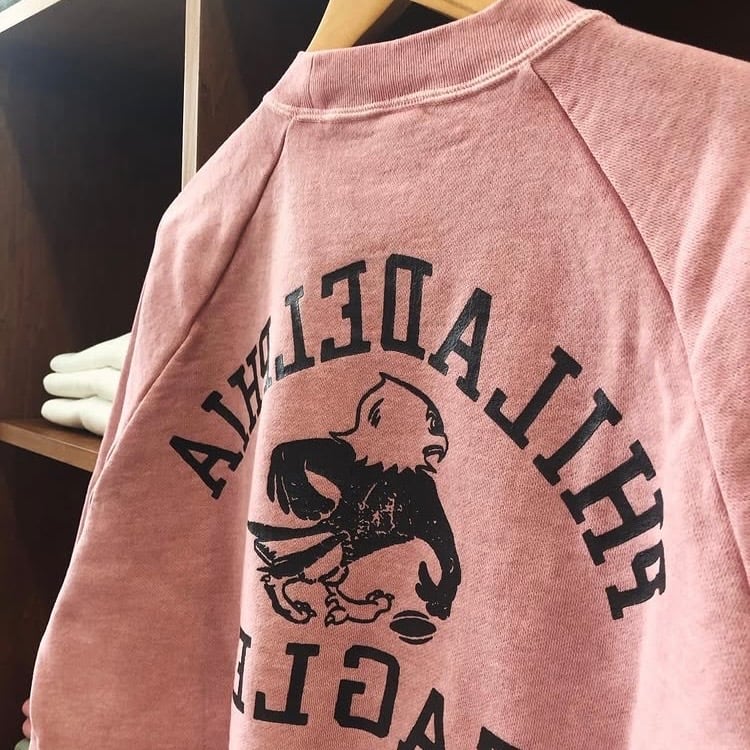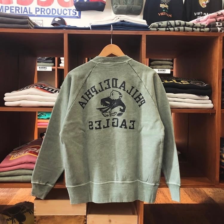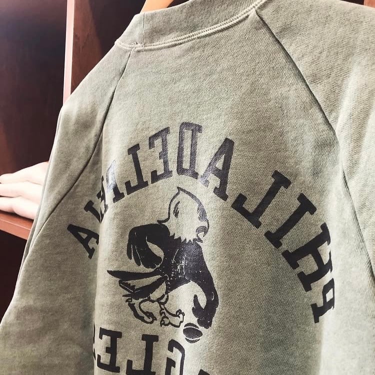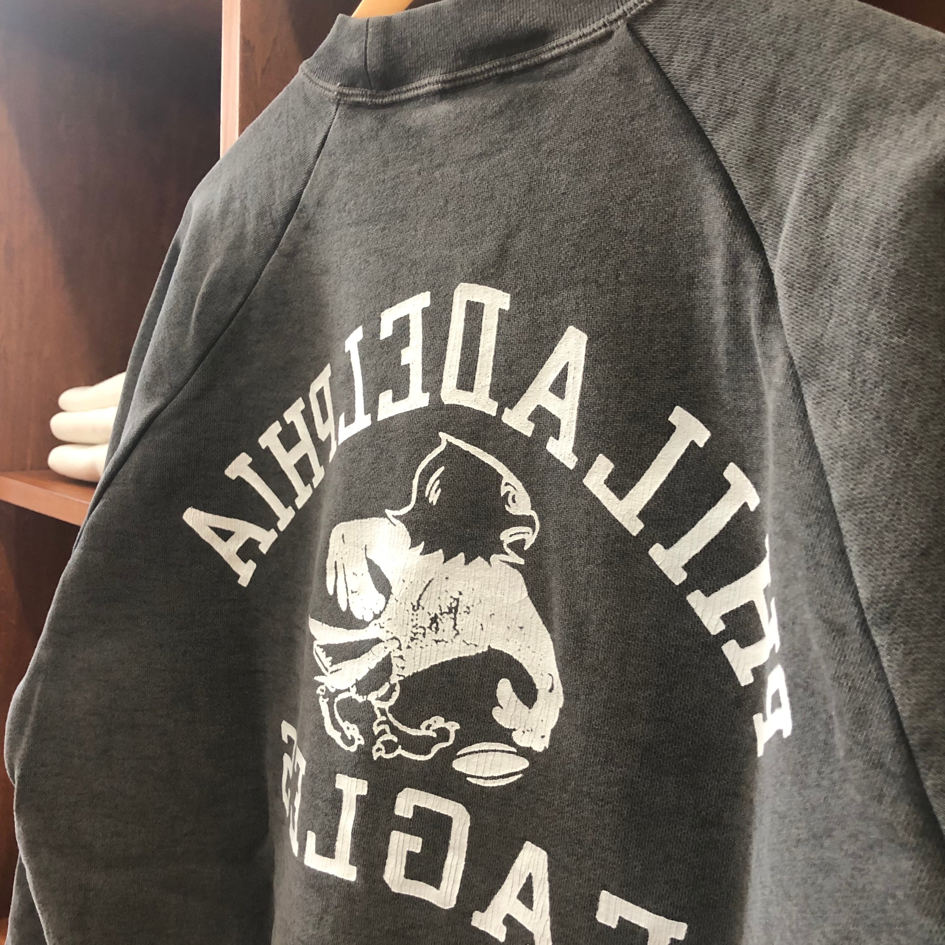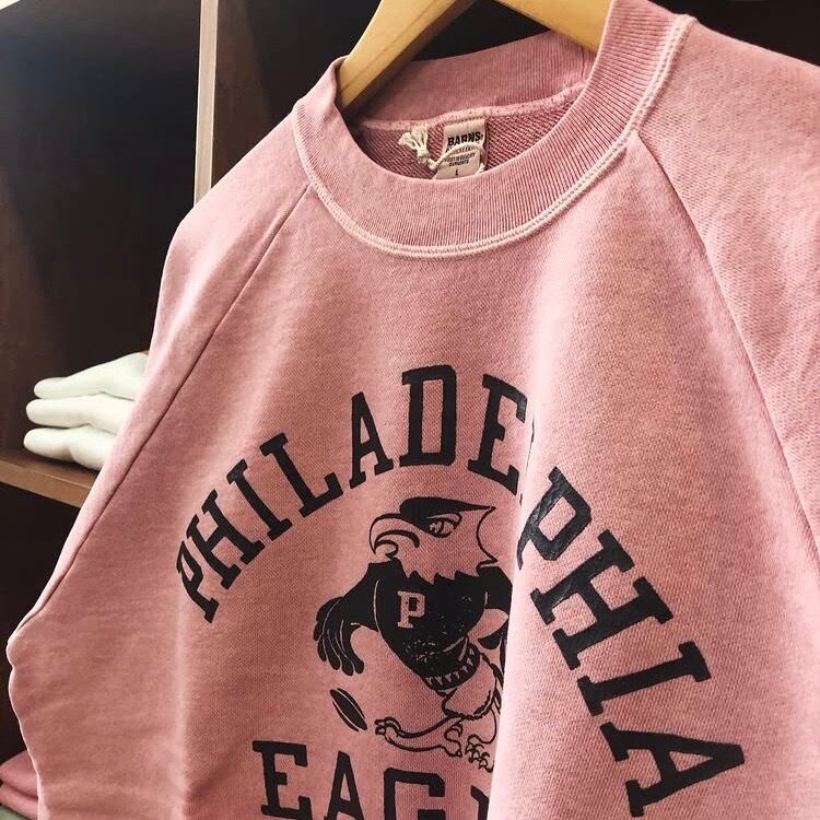 フロントに “PHILADELPHIA EAGLES” カレッジロゴをクラックプリントで配置し、ナチュラルな色落ちと古着風の風合いが特徴です。