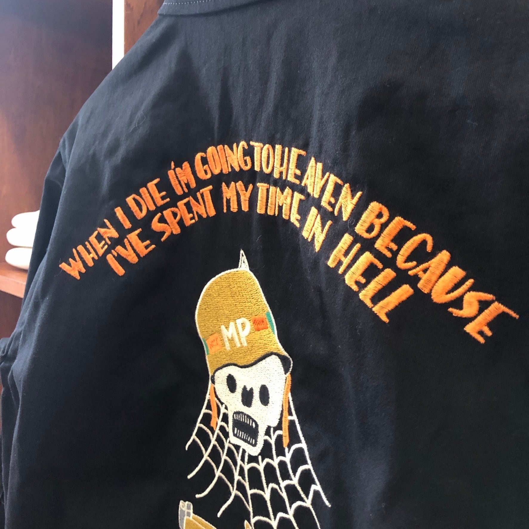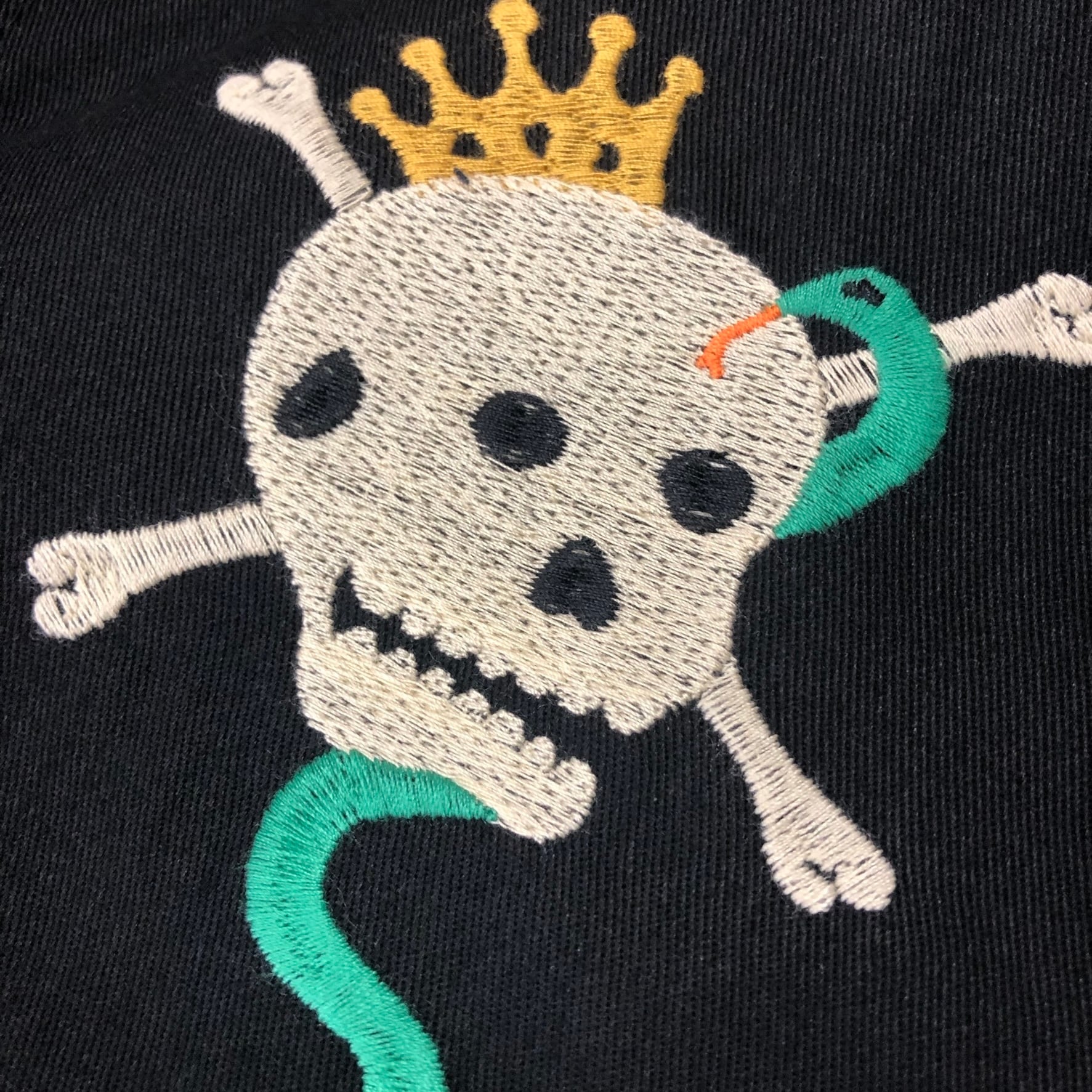 通気性の良い麻混生地で快適な着心地を実現し、背面にはインパクトのあるスカル柄刺繍を配置したヴィンテージライクなデザインが特徴です。